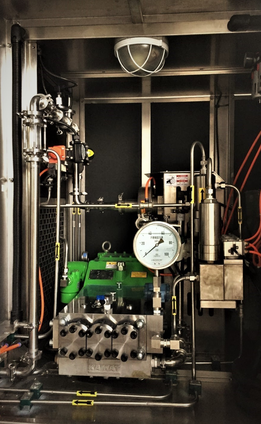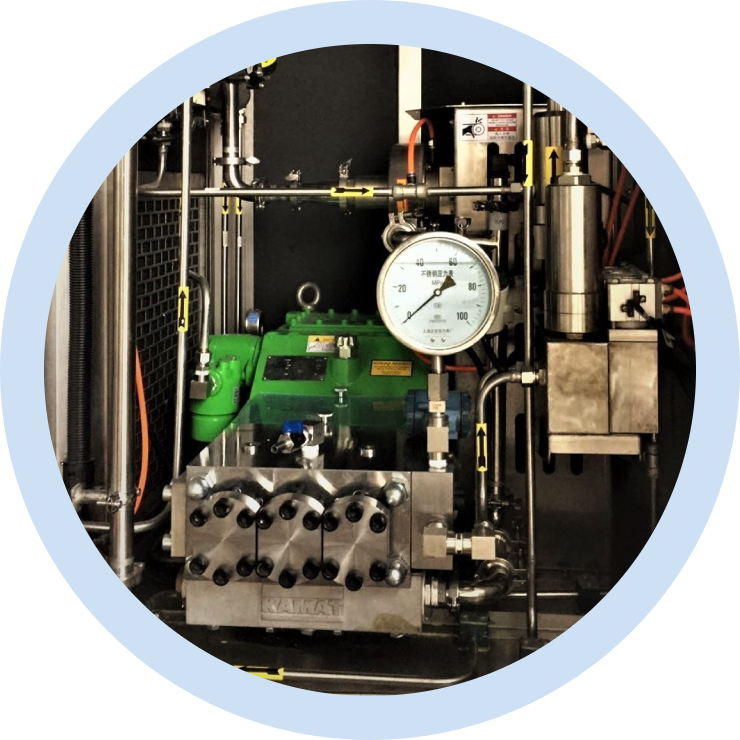 高压泵将介质进行加压,多相流在一定压力下通过能产生湍流、层流和对冲空化射流的组合微通道。多相介质在高速剪切效应、高压射流对冲撞击能量、流道瞬时压降产生的空化效应三重作用下,实现一相介质的高效超微粉碎π-π相互作用均质、乳化等作用。